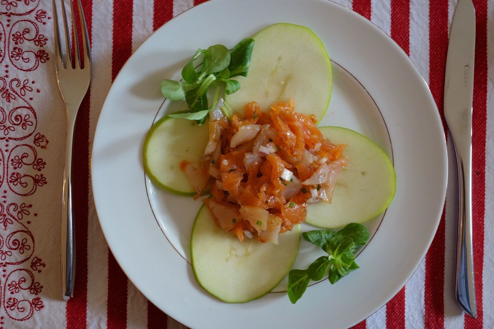 Tartare de poissons fumés sur sa rosace de pomme