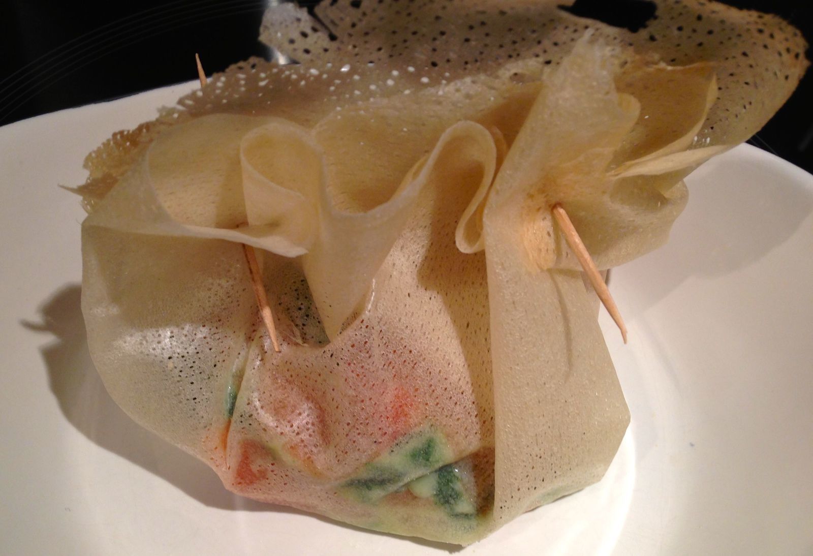 Refermer la feuille de brick avec des pics en bois de façon à obtenir une jolie aumônière.