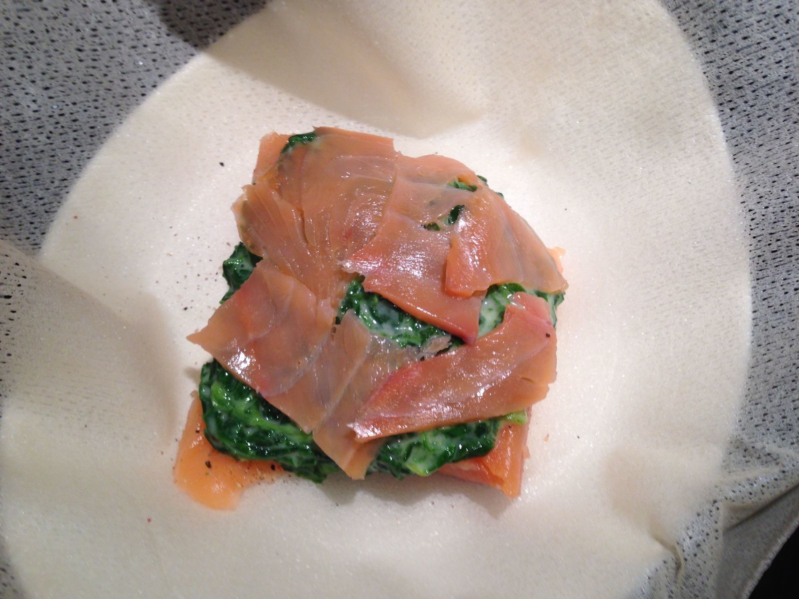 Sur chaque feuille de brick, placer un pavé de saumon (éventuellement coupé en deux dans la longueur s'il est trop long). Saler, poivrer. Le recouvrir d'une cuillère d'épinards puis de lamelles de saumon fumé.