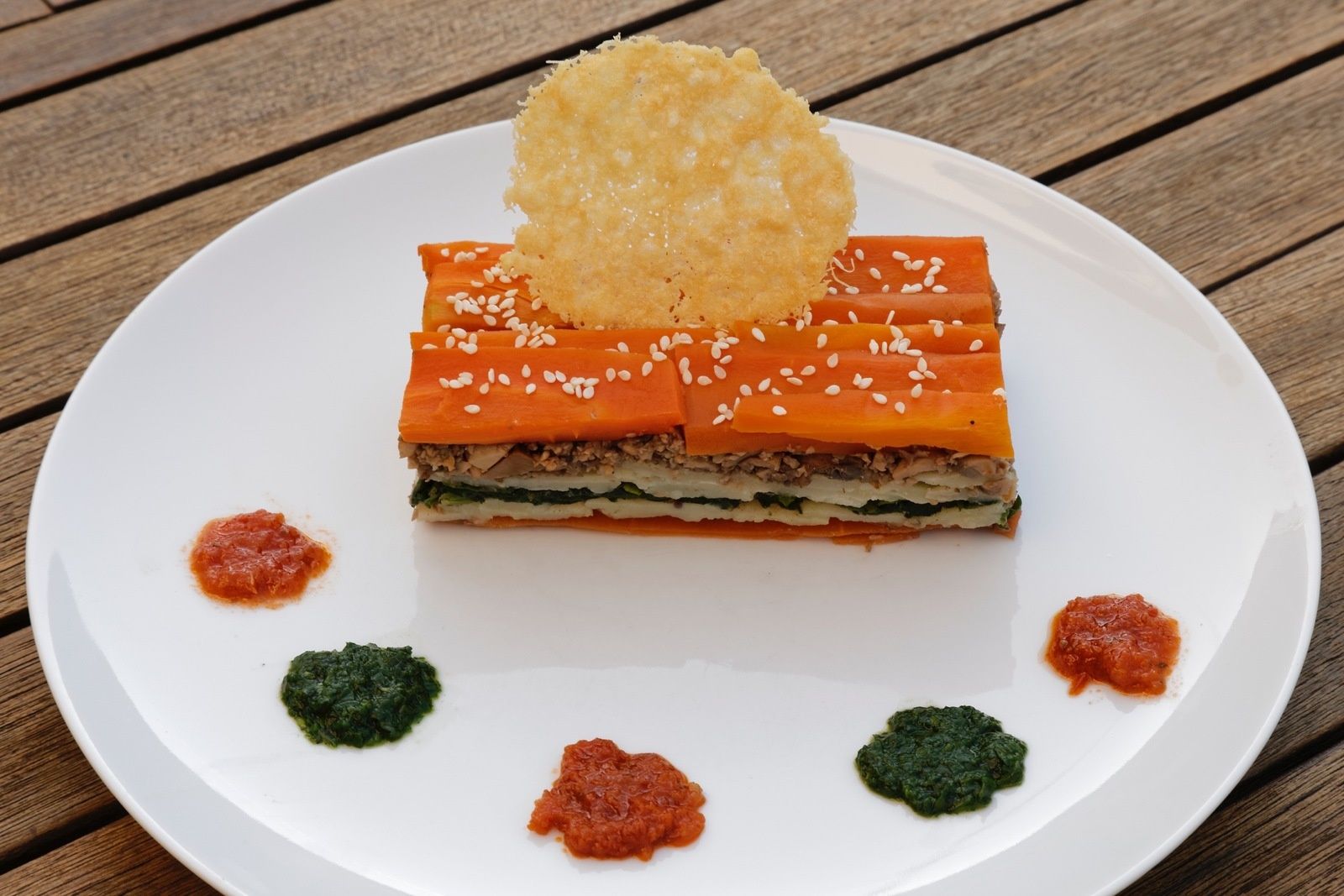 Millefeuille de légumes-Coulis d'herbes-Concassé de tomates au thym et sa tuile de parmesan